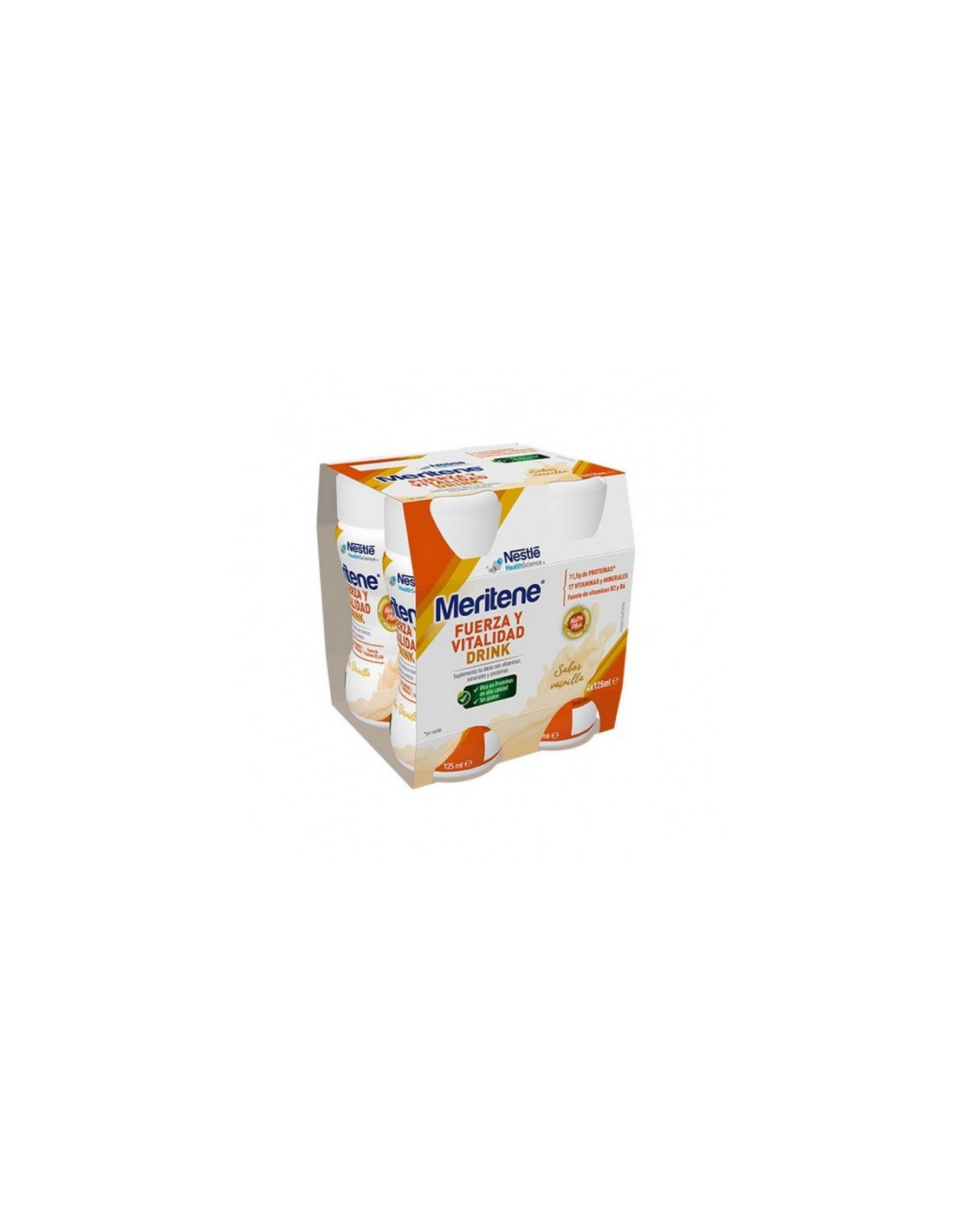 Meritene Fuerza y Vitalidad Drink Vainilla 4 unidades es un delicioso suplemento alimenticio con sabor de vainilla en batidos, listos para tomar.