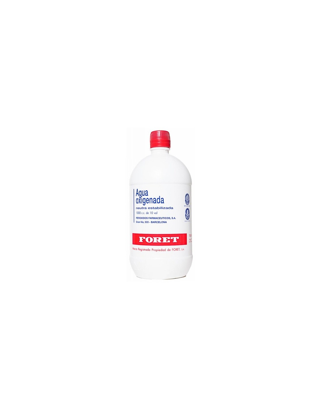 Agua oxígenada Foret 30mg/ml 1000ml, contiene peróxido de hidrógeno, antiséptico. Indicado en heridas superficiales de la piel y enjuagues bucales tras extracciones dentales.