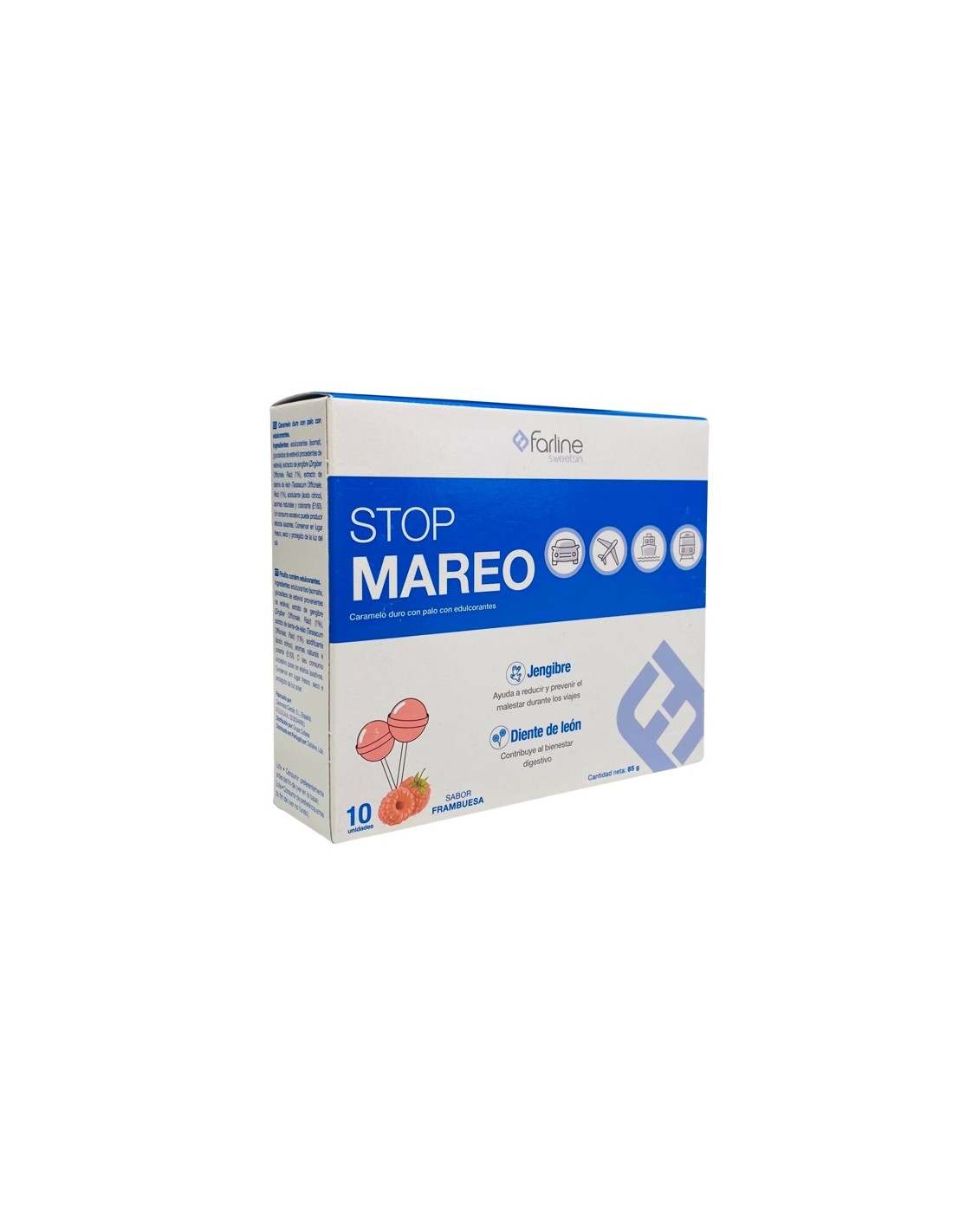 Farline chupa-chup Stop Mareo 10 unidades son caramelos duros con palo a base de jengibre y diente de león que ayuda a reducir y prevenir los mareos o malestar durante los viajes.