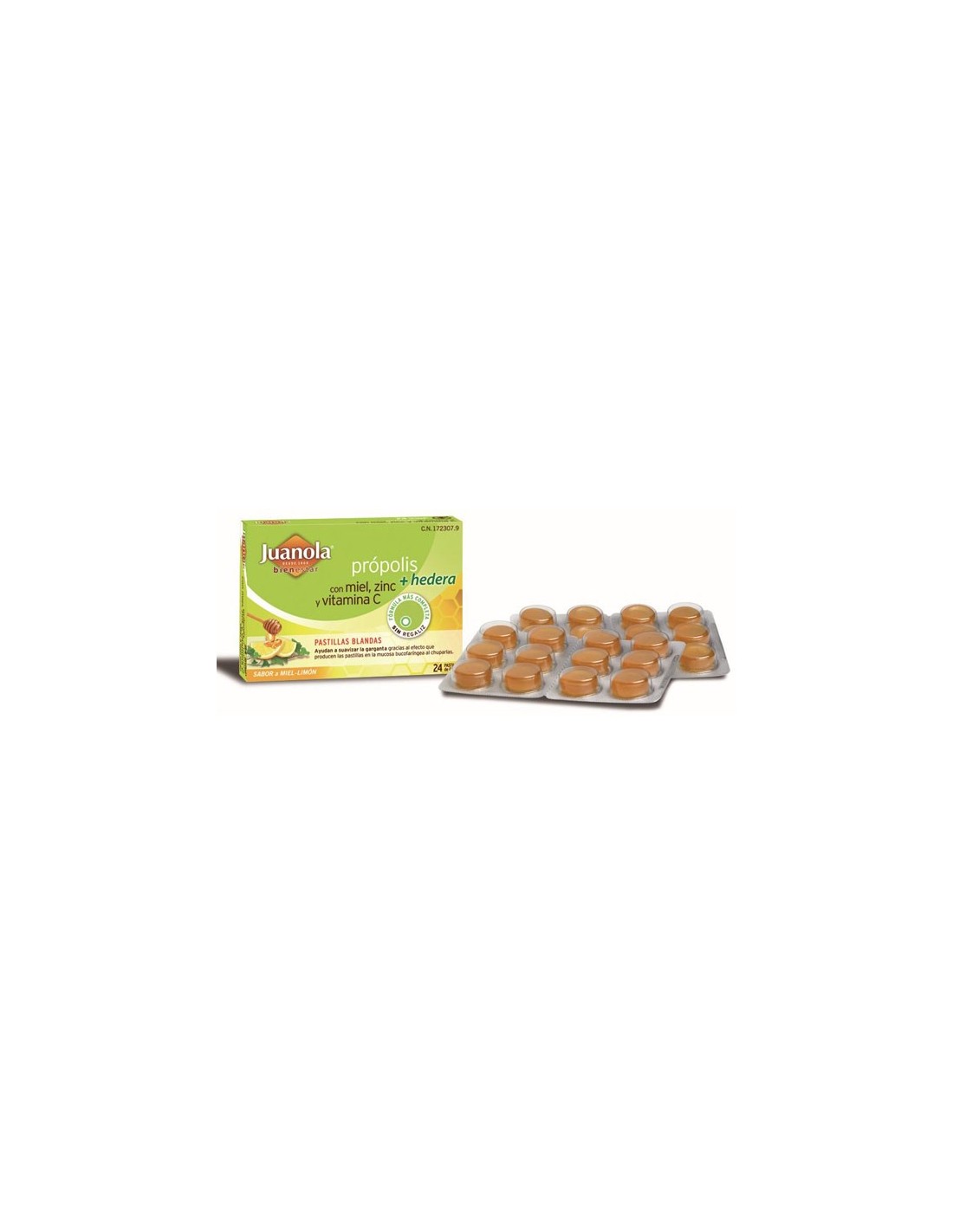 Juanola Propolis Hiedra Pastillas Miel Limón 24 Pastillas son unas pastillas blandas que combinan el efecto del extracto de própolis, la miel, el zinc y la vitamina C para suavizar la garganta, esta combinación de ingredientes mejora las molestias relacionadas con la garganta. Juanola Propolis Hiedra Pastillas Miel Limón 24 Pastillas se recomienda chupar 8 pastillas al día. Caramelos sin azúcar.