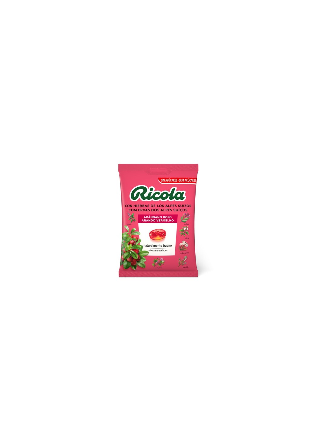 Ricola Caramelos sin azúcar Arándano Bolsa contienen hierbas cultivadas de forma natural en las montañas suizas.