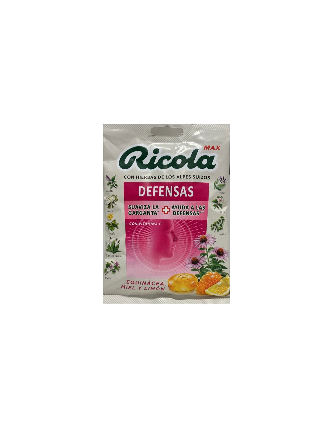 Ricola Max Defensas Caramelos bolsa Equinácea, miel y limón son caramelos de equinácea, miel y limón, con un extra de vitamina C para ayudar a las defensas y suavizar la garganta.