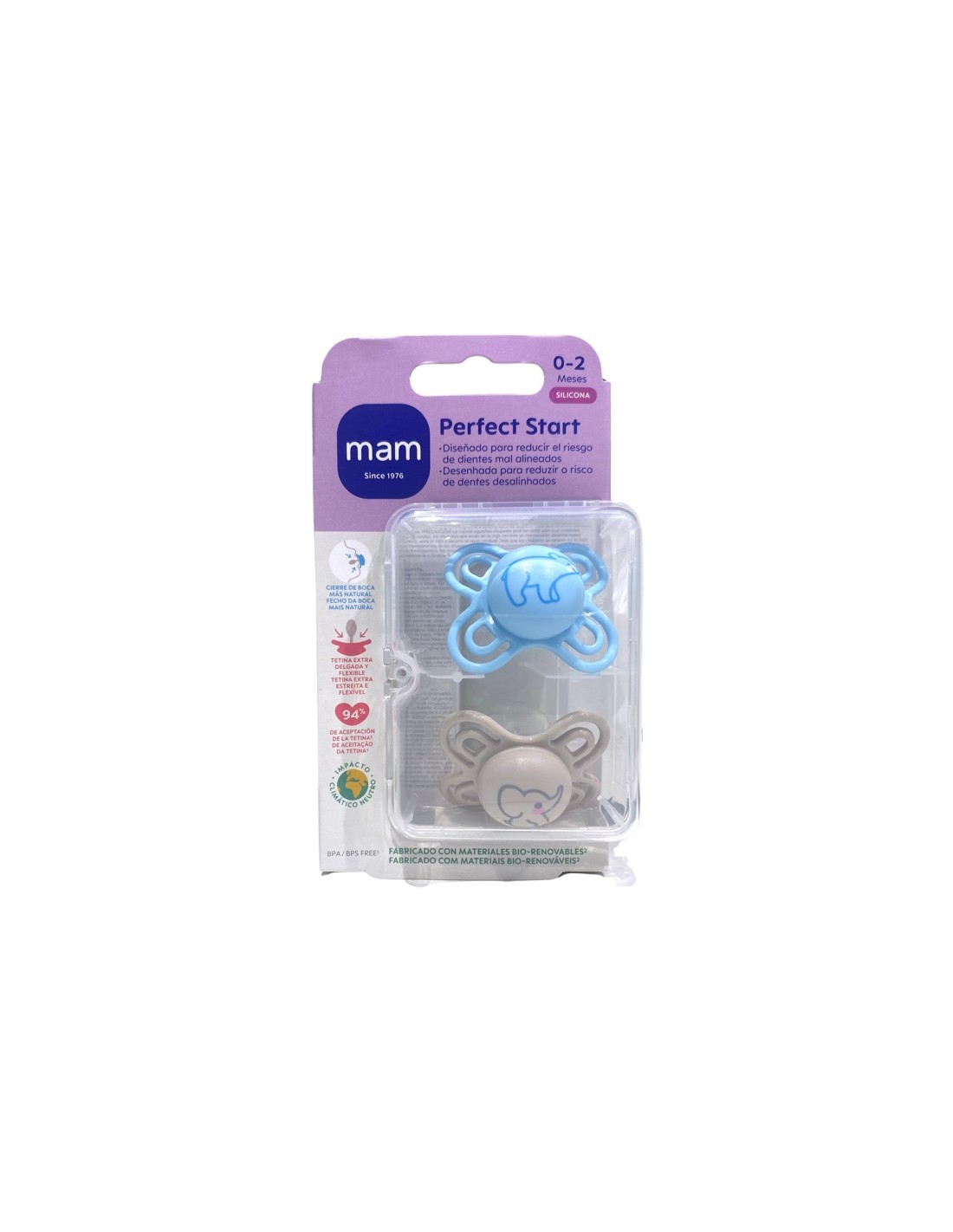Mam perfect 0-2 meses start chupete silicona azul con tetina especialmente fina y blanda.