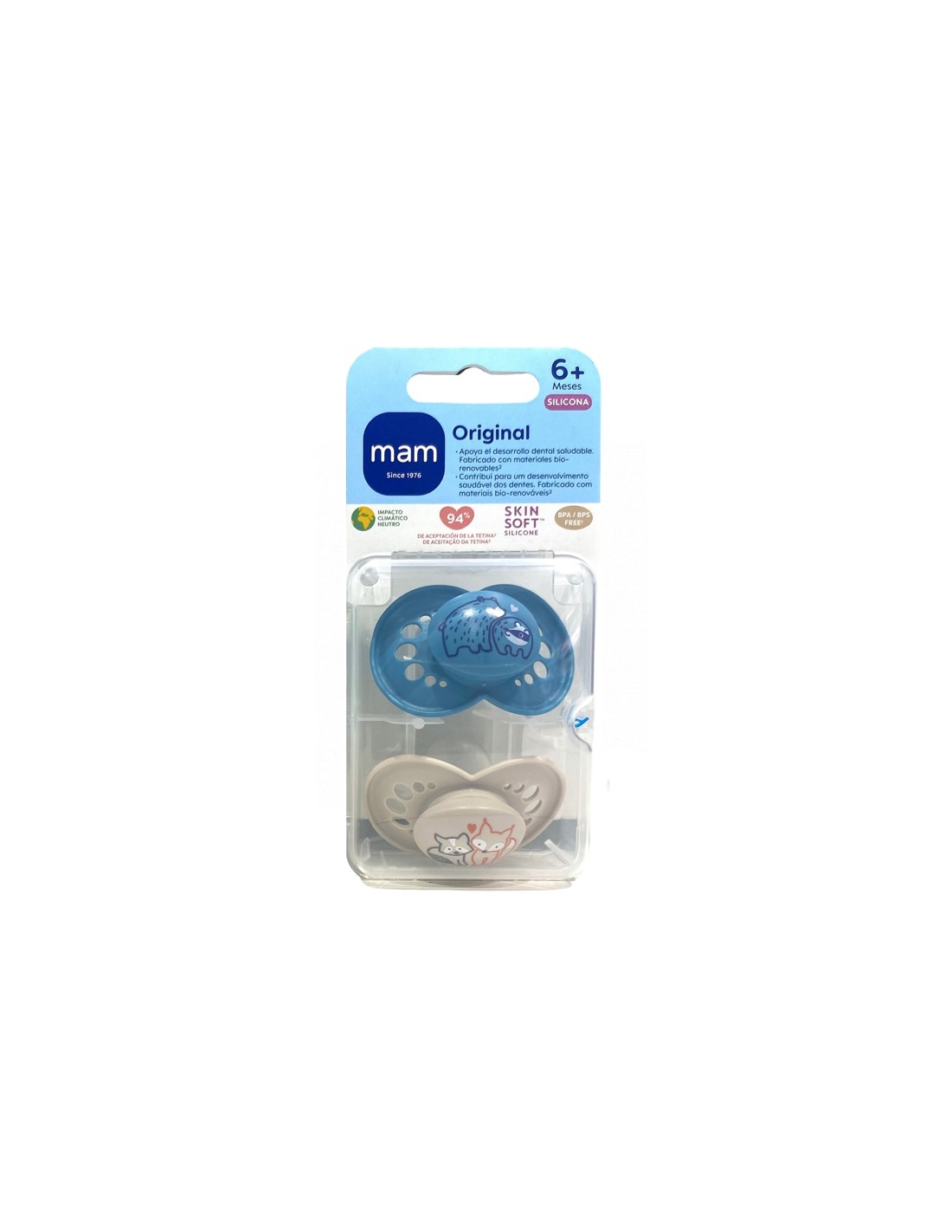 Mam Chupete silicona original +6m azul doble son dos chupetes desarrollados para bebés de más de 6 meses con tetina de silicona ultra suave.