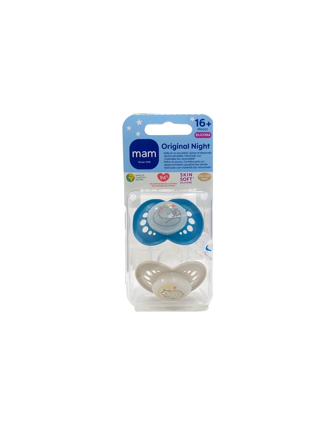 Mam Chupete Silicona Original Night +16 m azul doble son dos chupetes desarrollados para bebés de más de 16 meses.