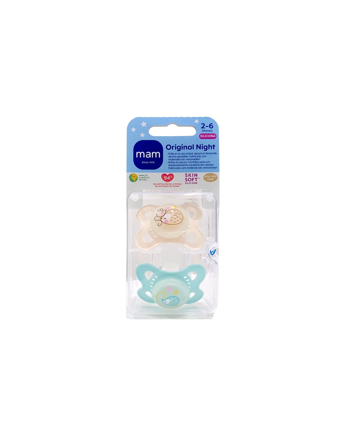 Mam Chupete Silicona Original Night 2-6 m neutro doble son dos chupetes desarrollados para bebés de 2 a 6 meses.