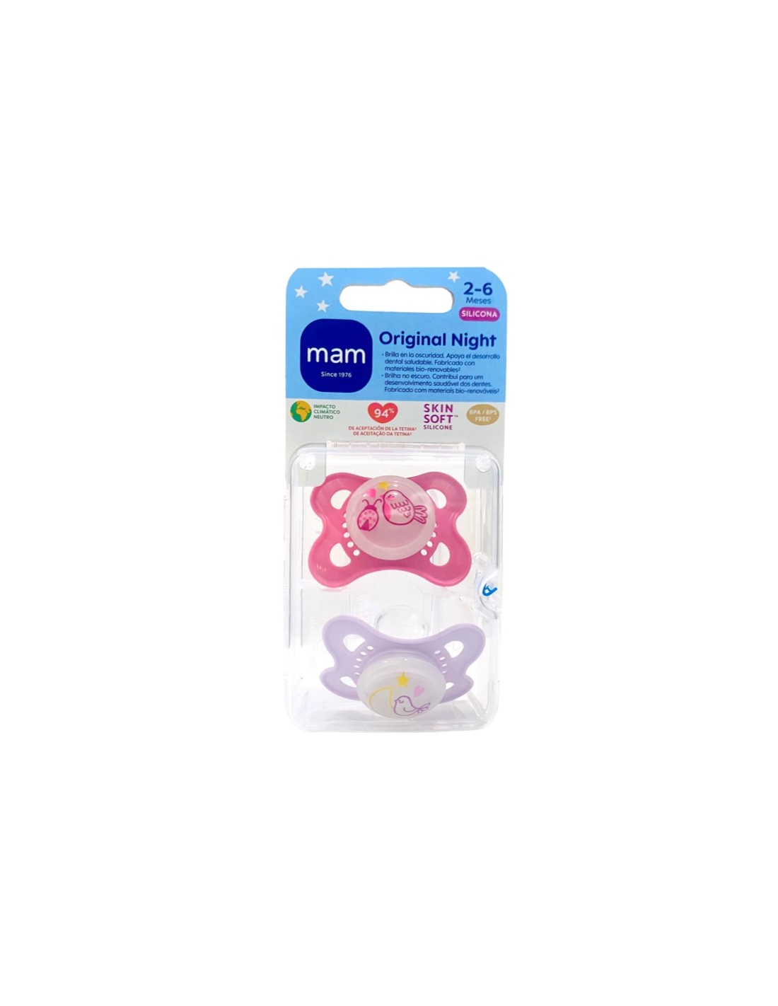 Mam Chupete Silicona Original Night 2-6 m rosa doble son dos chupetes desarrollados para bebés de 2 a 6 meses.