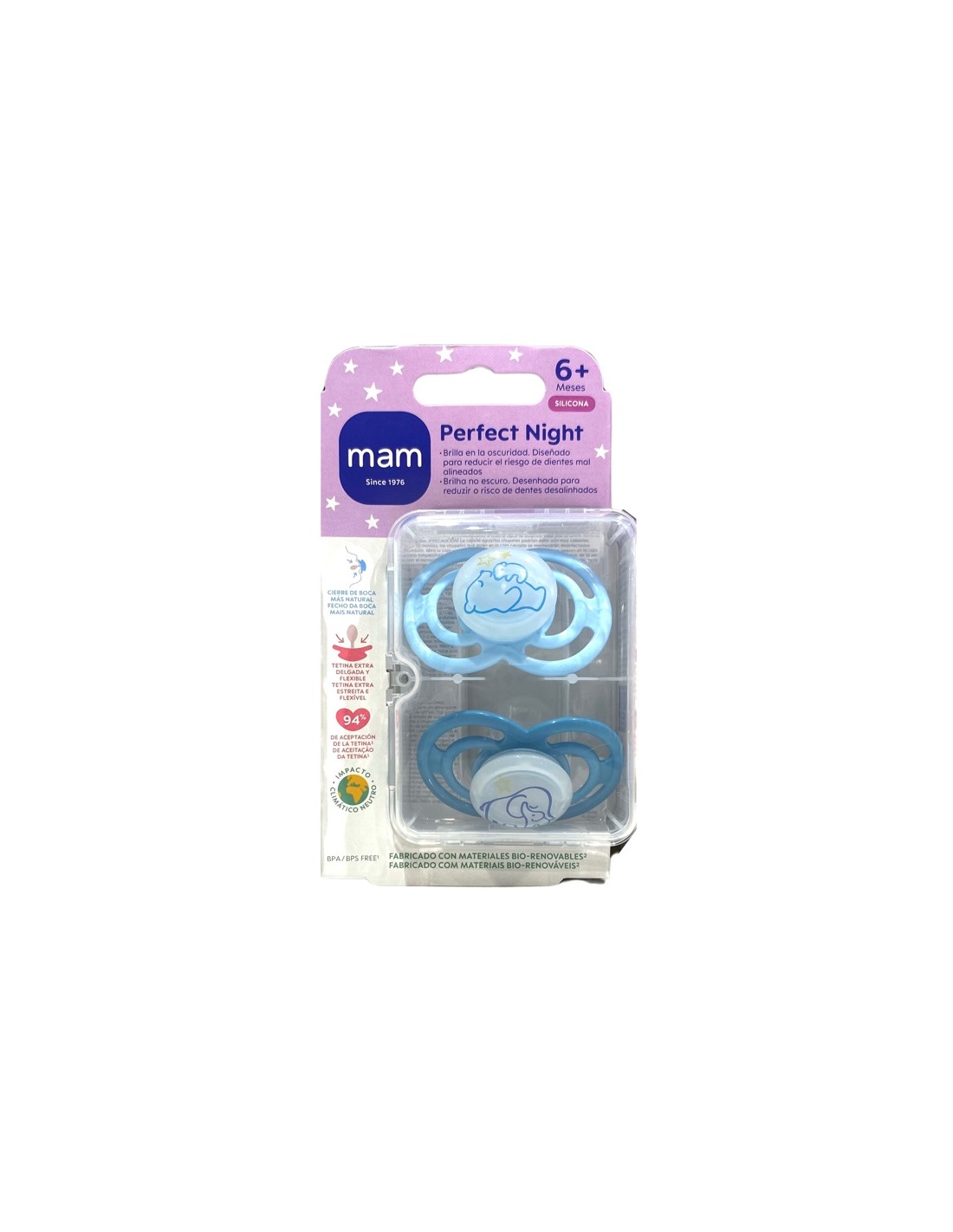 Mam Chupete Silicona Perfect Night +6 m azul doble es un pack de 2 chupetes para bebés de +6 meses, cuyo material y forma están patentados por odontopediatras.
