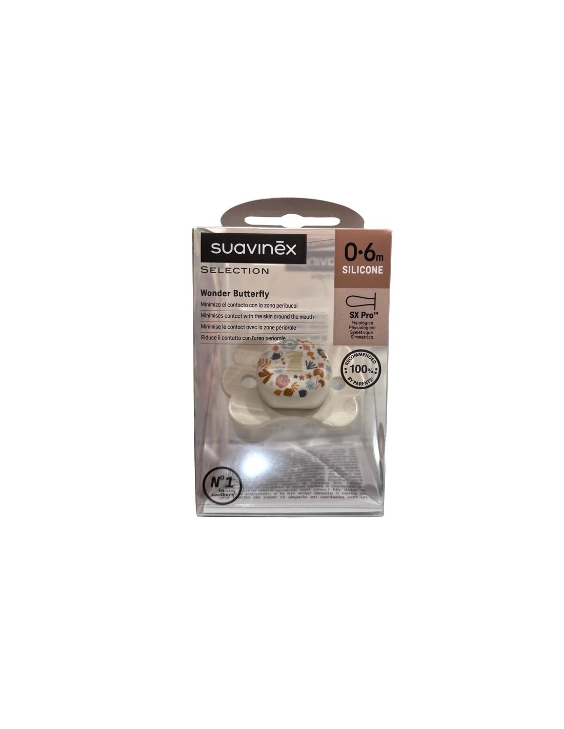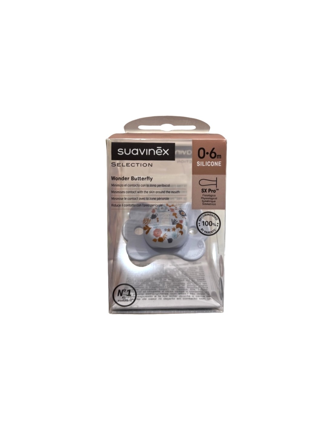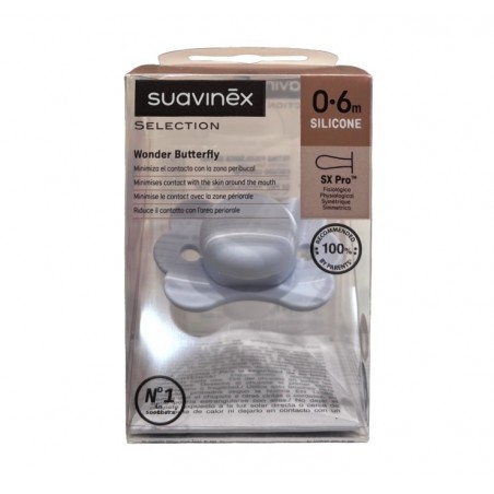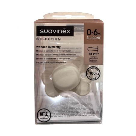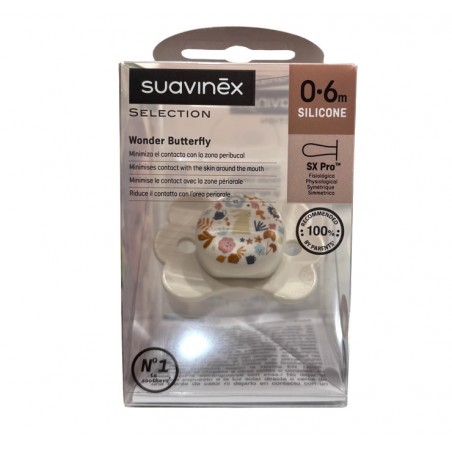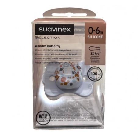 Suavinex Chupete Selection Wonder Butterfly 0-6m es un chupete de silicona fisiológico diseñado para ofrecer un mayor confort y cuidado, minimizando el contacto con la zona peribucal.