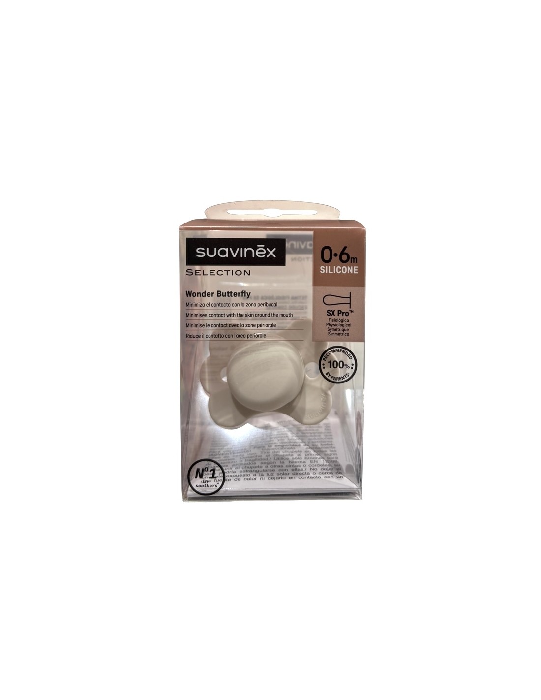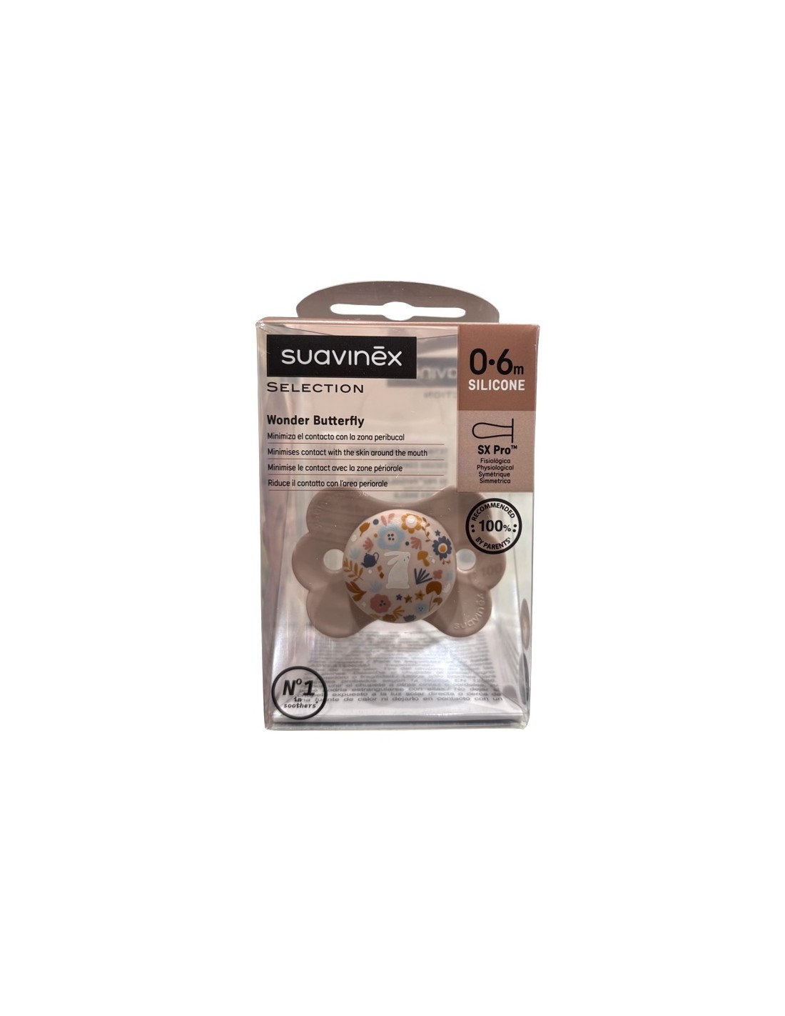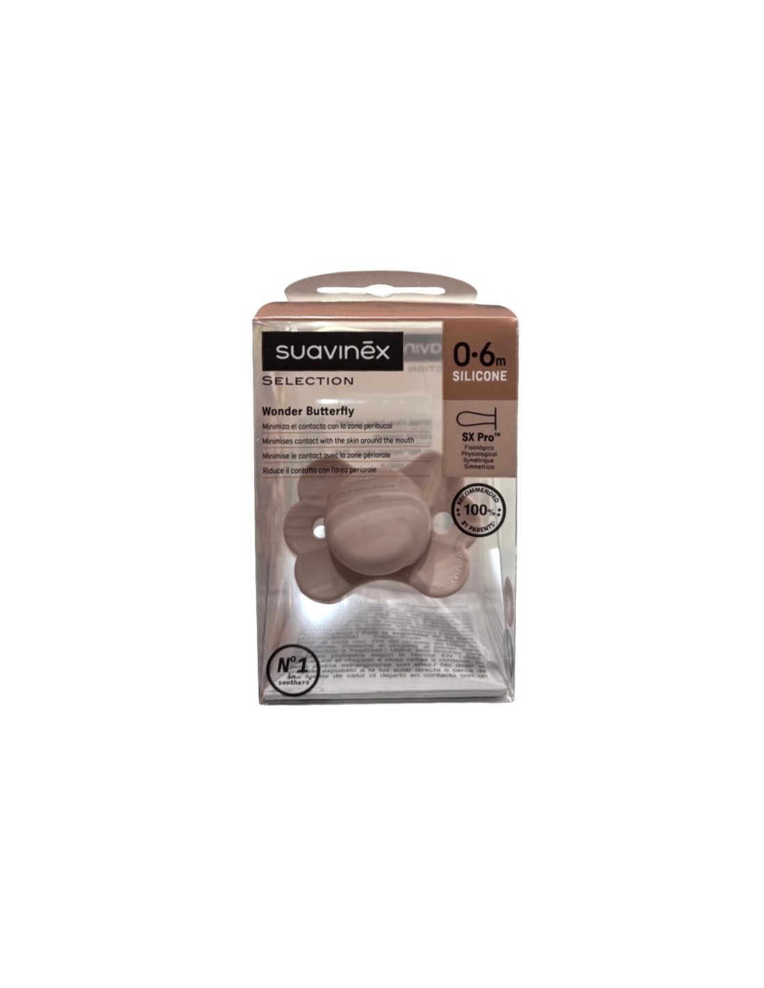 Suavinex Chupete Selection Wonder Butterfly 0-6m es un chupete de silicona fisiológico diseñado para ofrecer un mayor confort y cuidado, minimizando el contacto con la zona peribucal.