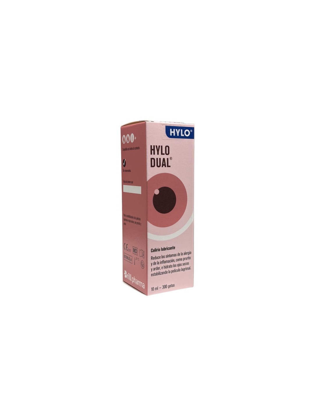 Hylo Dual reduce los síntomas de la alergia como la inflamaación, el prurito y el ardor. Hidrata los ojos secos estabilizando la película lagrimal. Protege frente a la evaporación excesiva de lágrimas.