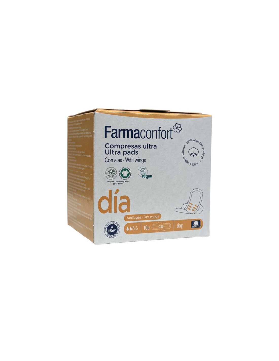 COMPRESAS 100% ALGODON FARMACONFORT ULTRAFINAS DIA ALAS están desarrolladas, con puro algodón 100% hipoalergénico.