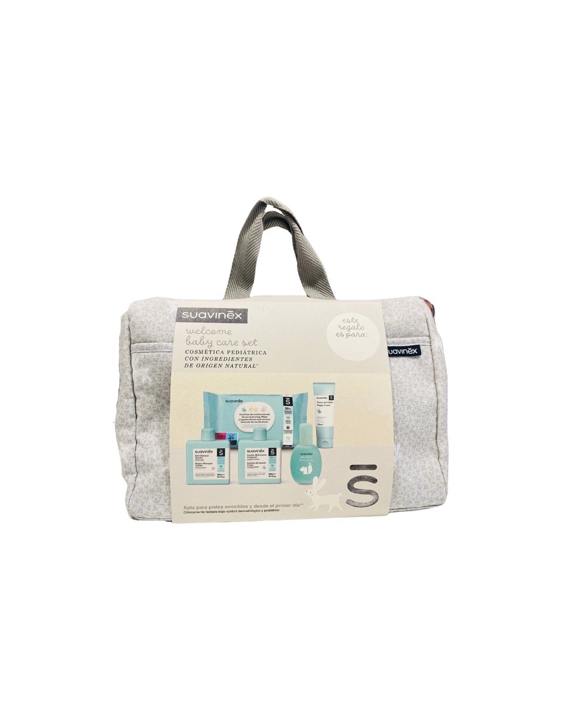 Este Bolso de paseo en color gris incluye todo lo necesario para la higiene y cuidado de tu bebé:
