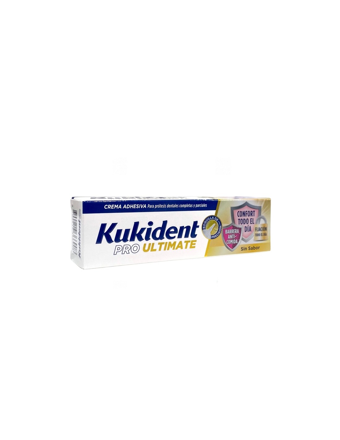 Kukident Pro Ultimate Barrera anticomida 40 g sin sabor es una crema adhesiva especialmente diseñada para prótesis dentales, ayudando a fijarlas de manera firme y cómoda.