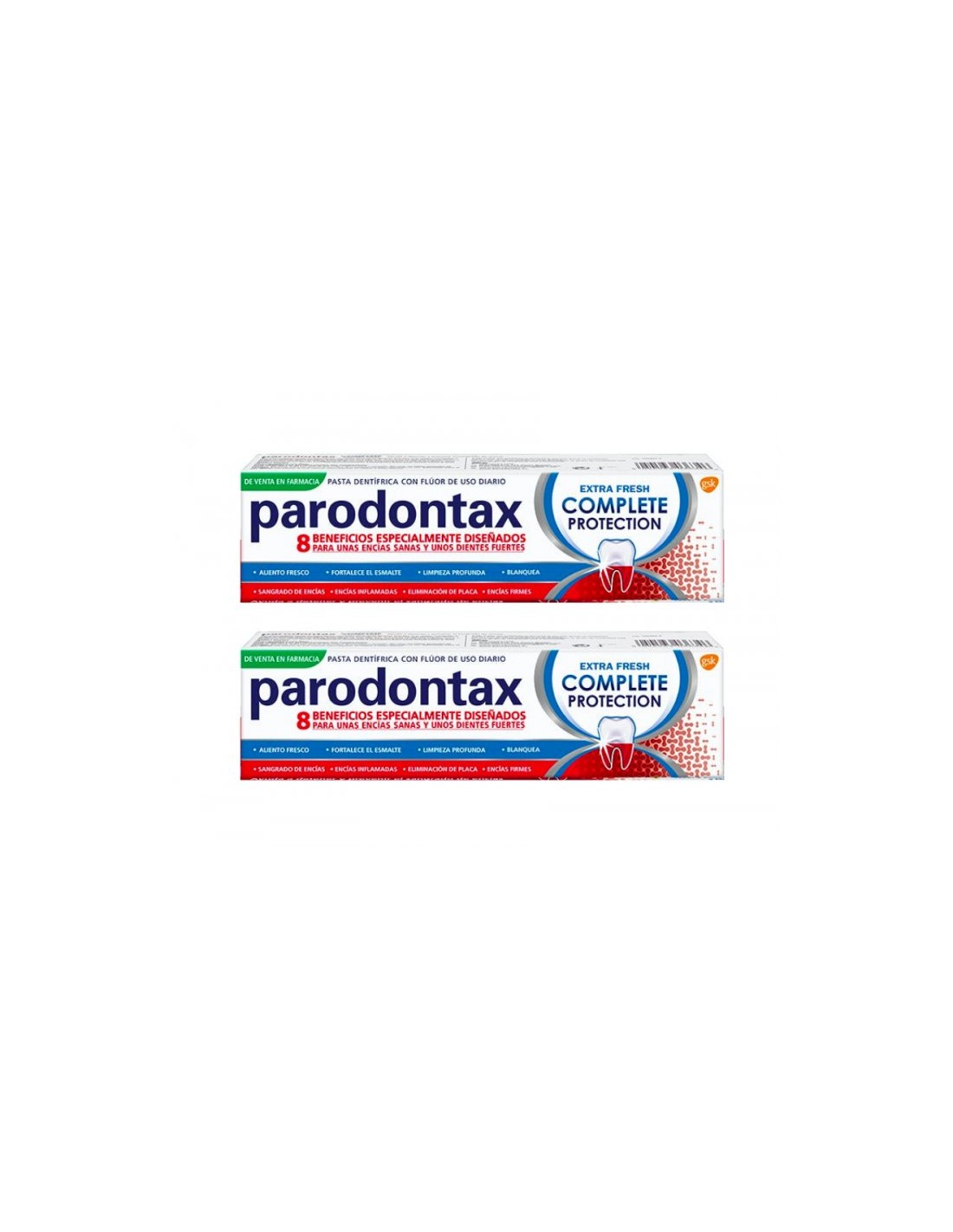 Parodontax Complete Extra Fresh Duplo 75 mL elimina físicamente la acumulación de placa bacteriana de la línea de la encía y ayuda a mantener la unión entre las encías y los dientes.