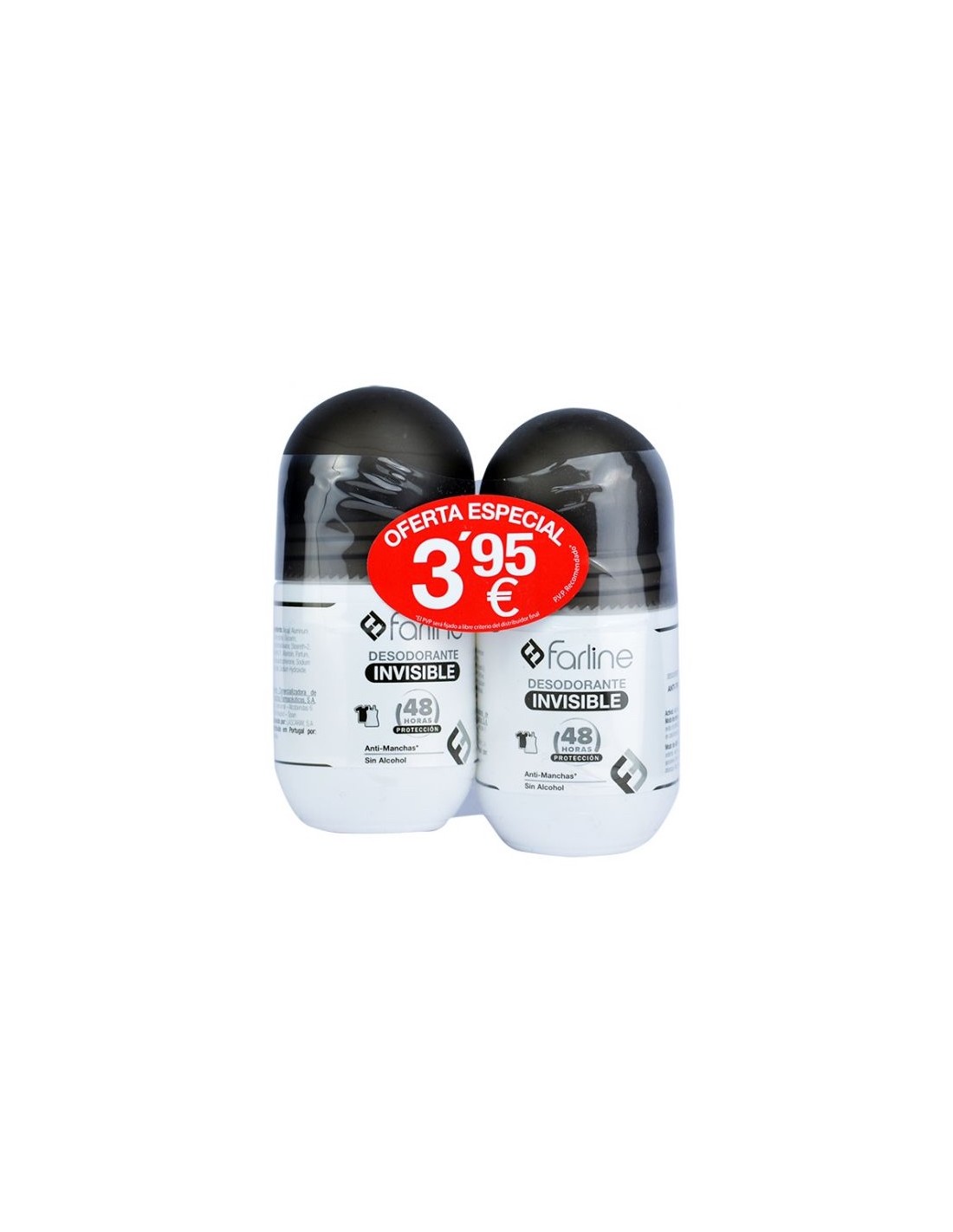 Farline duplo Desodorante Invisible 48h roll on no mancha la ropa y garantiza una protección durante 48 horas.