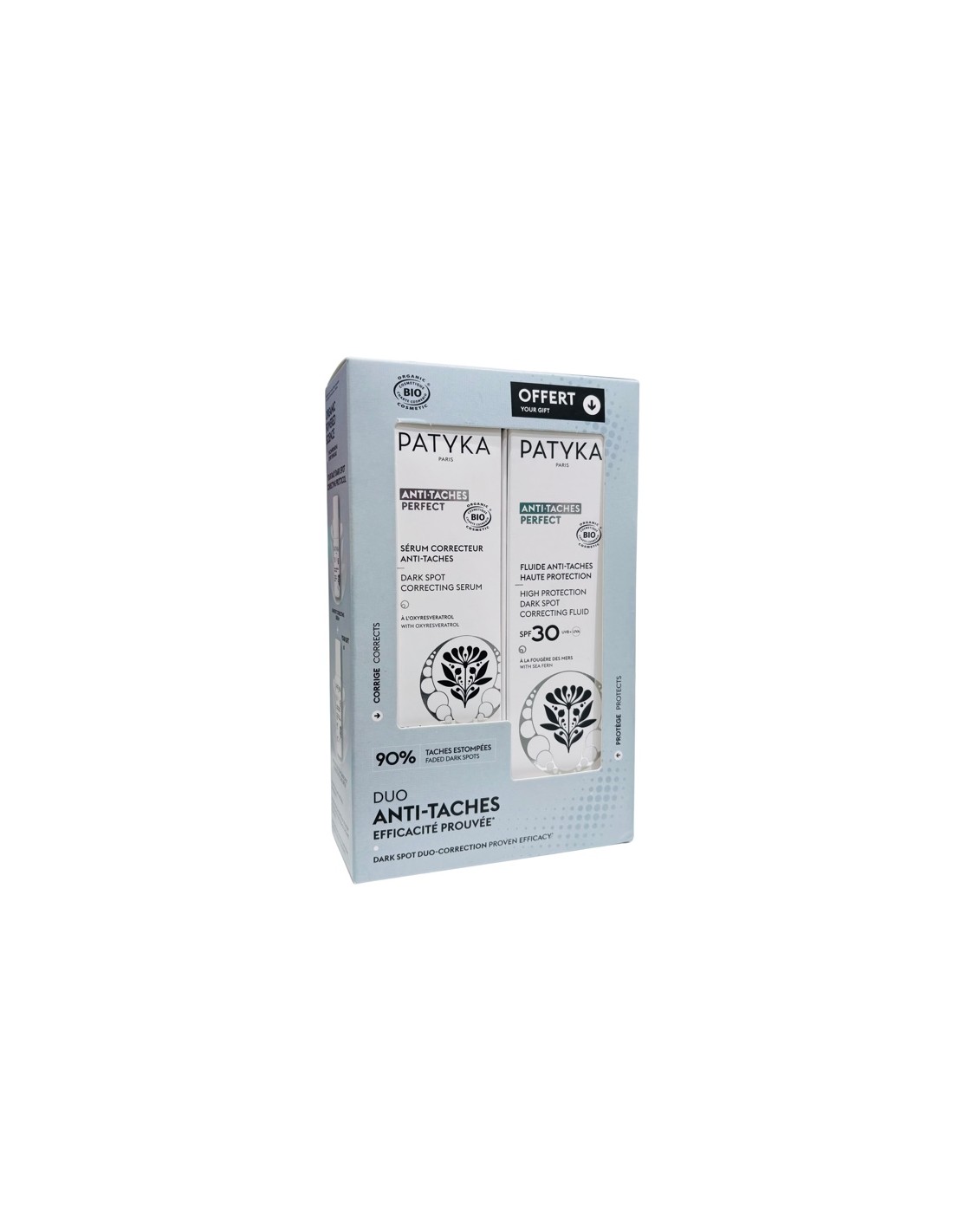 Patyka Fluido Anti Manchas SPF 30 50 mL combina el excepcional poder aclarante del Helecho Marino con la doble protección UVA/UVB y antirradicales libres para prevenir y corregir la aparición de todo tipo de manchas (lentigos solares, manchas de la edad, manchas postinflamatorias, melasma).