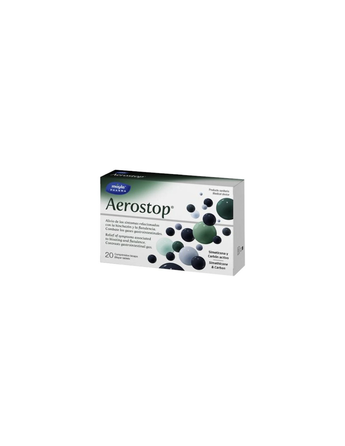 Aerostop 20 comprimidos Mayla es un producto sanitario con simeticona y carbón activo que alivia los síntomas relacionados con la hinchazón, la flatulencia.