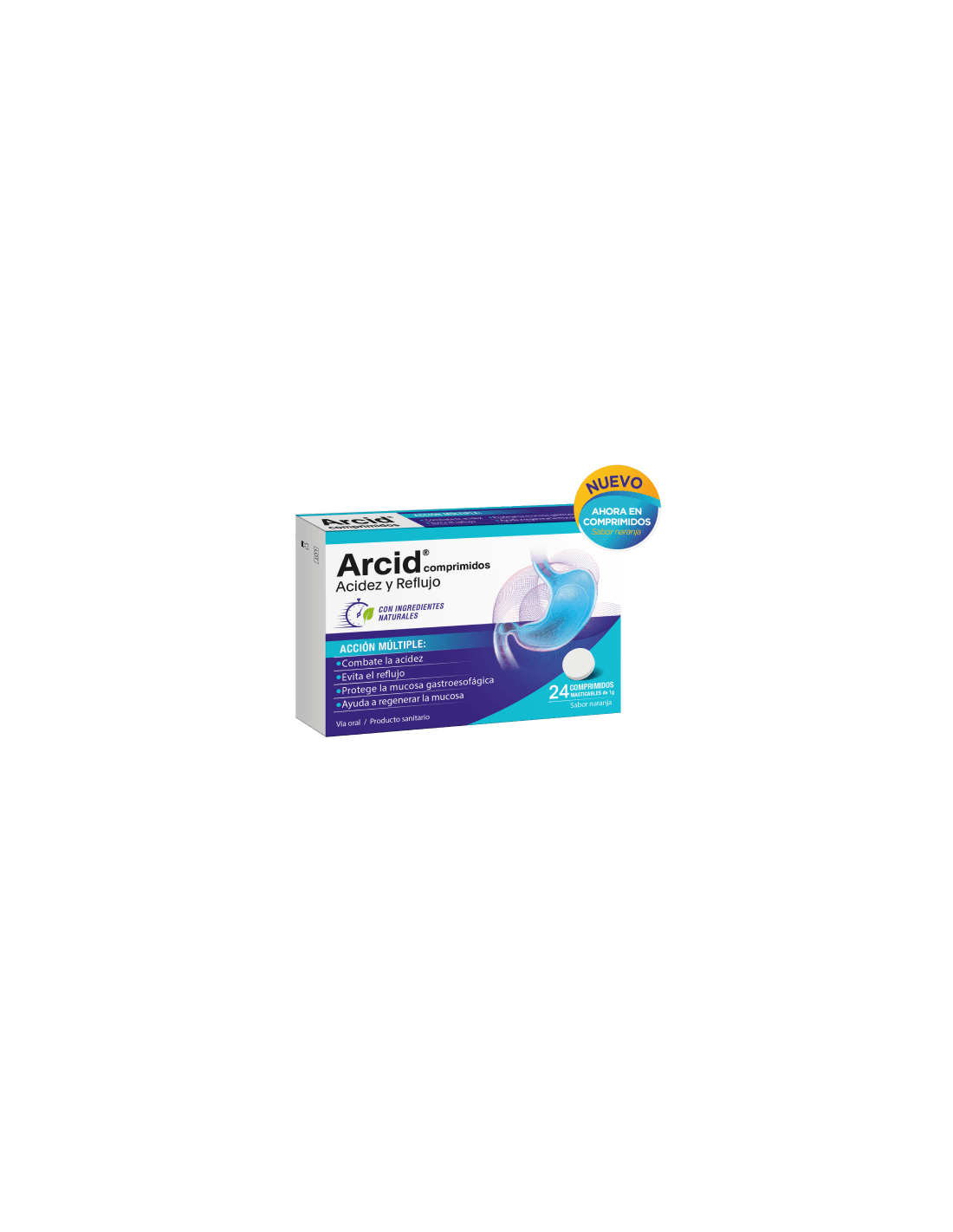 Arcid 24 comprimidos masticables sabor naranja contiene ingredientes naturales que contribuyen al alivio y protección frente a los síntomas del reflujo gastroesofágico y faringolaríngeo.