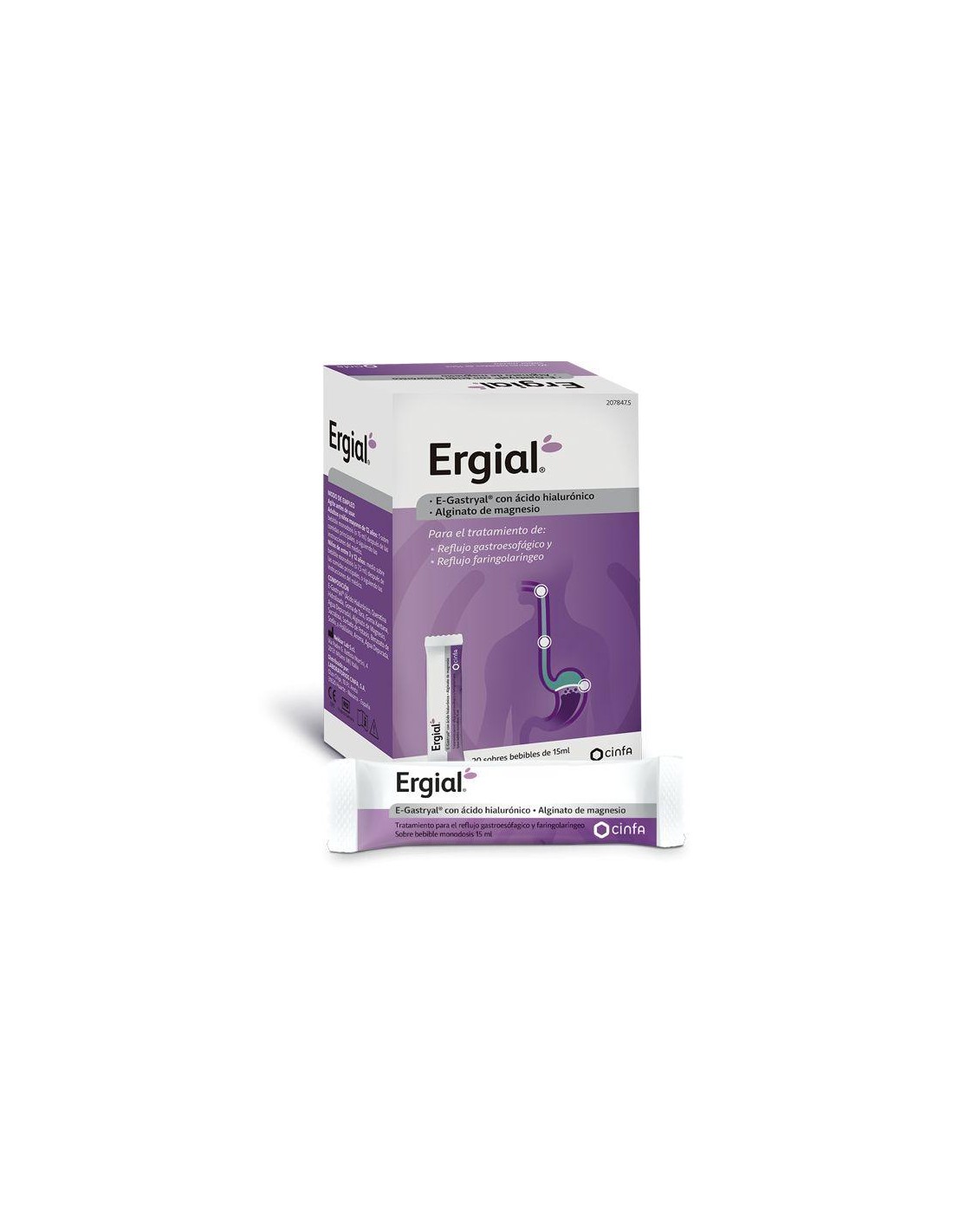 Ergial 20 sobres bebibles 15 mL está diseñado para abordar los síntomas asociados a la enfermedad por reflujo gastroesofágico o ERGE y reflujo faringolaringeo o RFL.