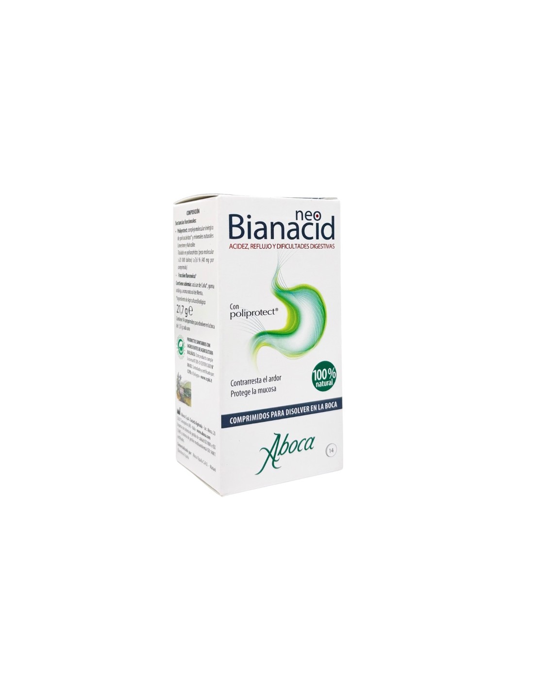 Neobianacid 14 comprimidos Sabor limón es un producto sanitario a base de complejos moleculares vegetales y minerales que ejerce una acción protectora y lenitiva de la mucosa gastroesofágica útil para contrarrestar rápidamente el ardor, el dolor, reflujo gastroesofágico y gastritis.
