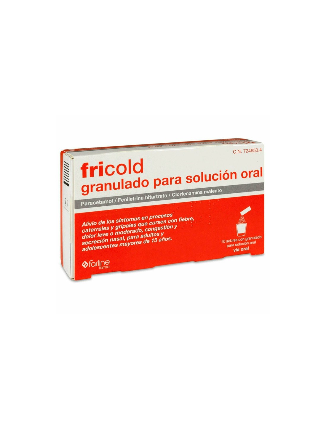 Fricold 10 Sobres | Anticatarral es un medicamento que combina paracetamol, fenilefrina y clorfenamina para aliviar los síntomas del catarro, resfiado y la gripe tales como fiebre, congestión y secreción nasal y dolor.
