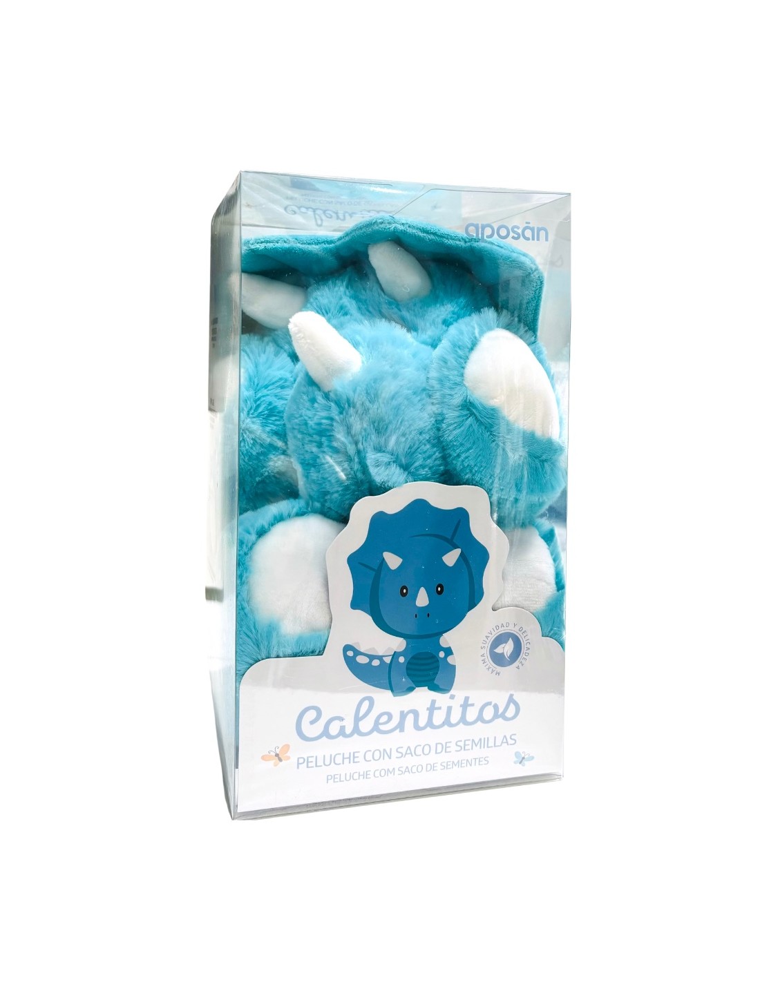 Aposan calentitos Dino es un peluche con saco extraíble de semillas de trigo esterilizadas para el microondas, conserva el calor durante un largo periodo de tiempo y tiene un efecto relajante instantáneo.
