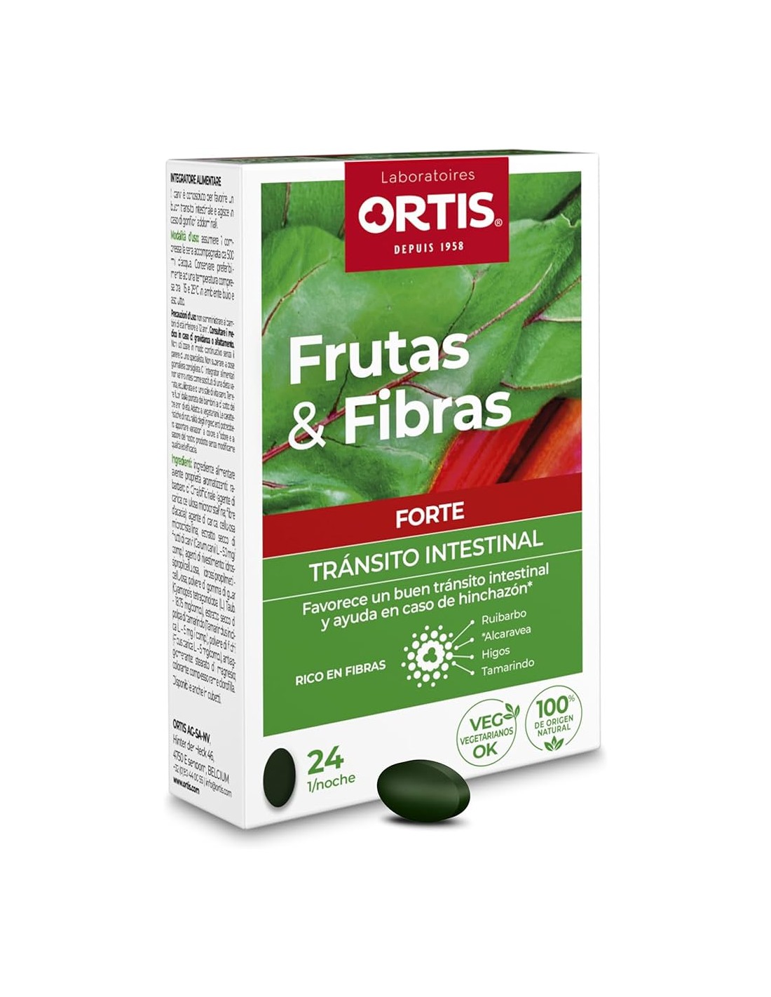 Frutas y Fibras Forte 24 comprimidos favorece el tránsito intestinal y reduce la sensación de hinchazón gracias a la presencia de alcaravea.