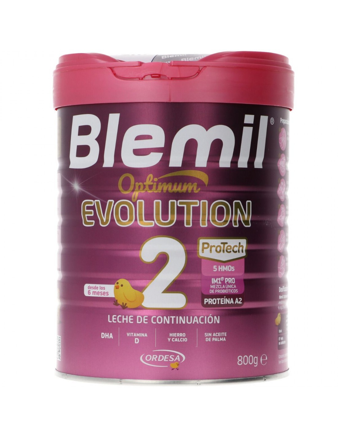 Blemil Optimum Evolution 2 800g para bebés a partir de 6 meses, posee una exclusiva fórmula que incluye la proteína A2, de fácil digestión, IM1 Pro exclusivo mix con 6 probióticos, 5HMOs y proteínas bioactivas.