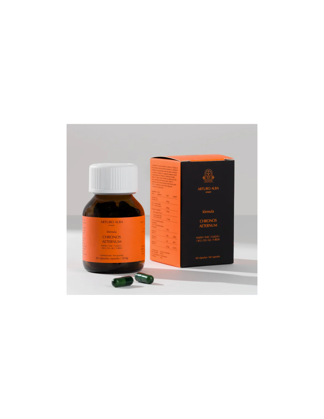 Arturo Alba Chronos Aeternum 60 cápsulas es un complemento alimenticio que combina nutrientes esenciales como resveratrol, coenzima Q10, ácido alfa-lipoico, vitamina C, vitamina E y zinc.