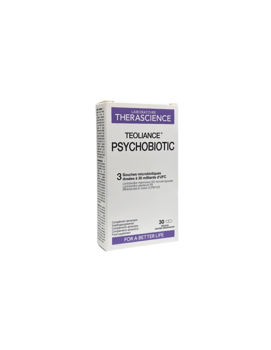 Teoliance Psychobiotic 30 cápsulas contiene cepas de microbiota registradas con eficacia clínicamente demostrada: Lactobacillus plantarum P8, Bifidobacterium breve CCFM1025 y Lactobacillus rhamnosus GG.