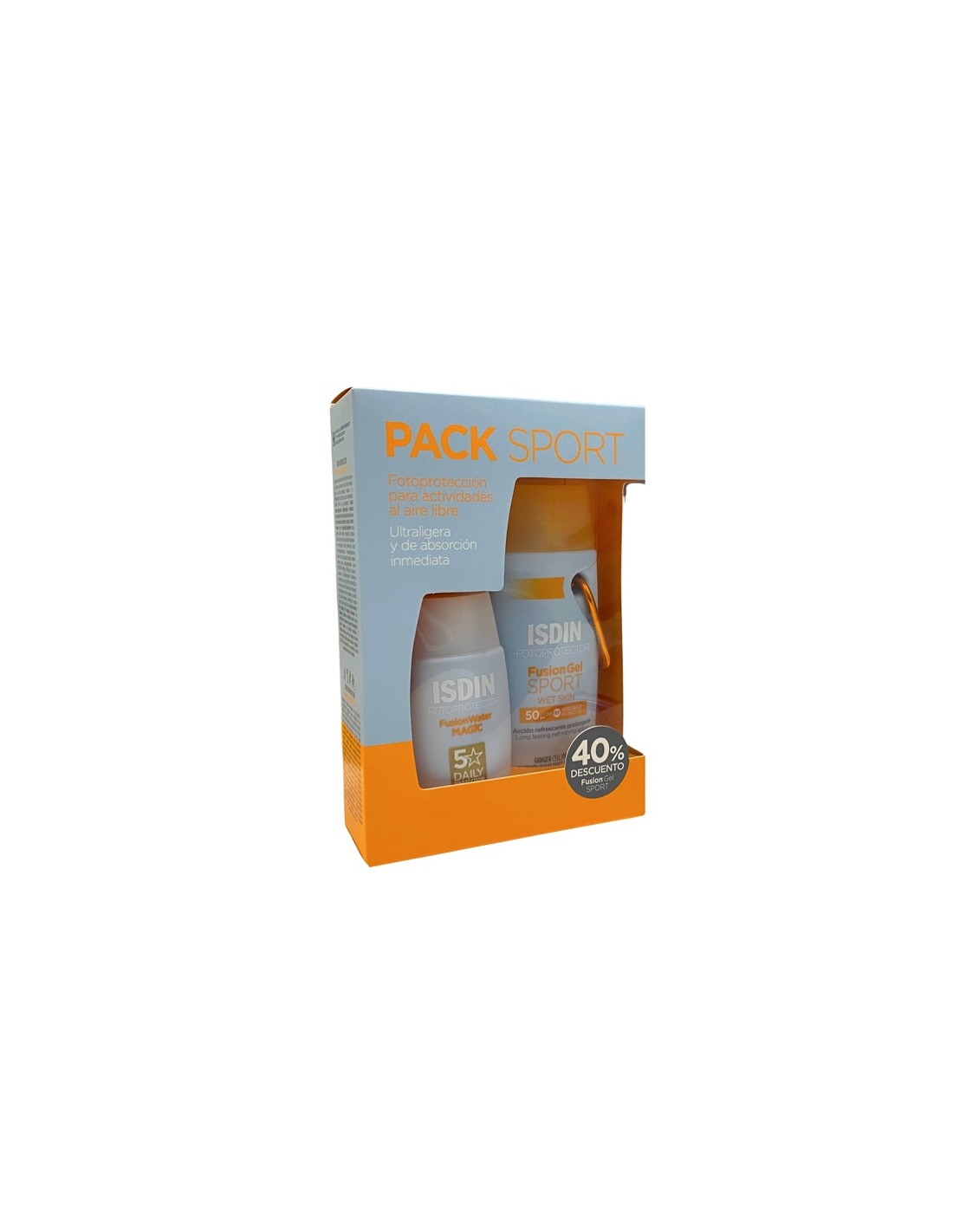 Este pack sport consta de Fotoprotector FusionGel Sport Wet Skin SPF 50 y Fotoprotector Fusion Water Magic SPF 50. Resistente al agua y al sudor.