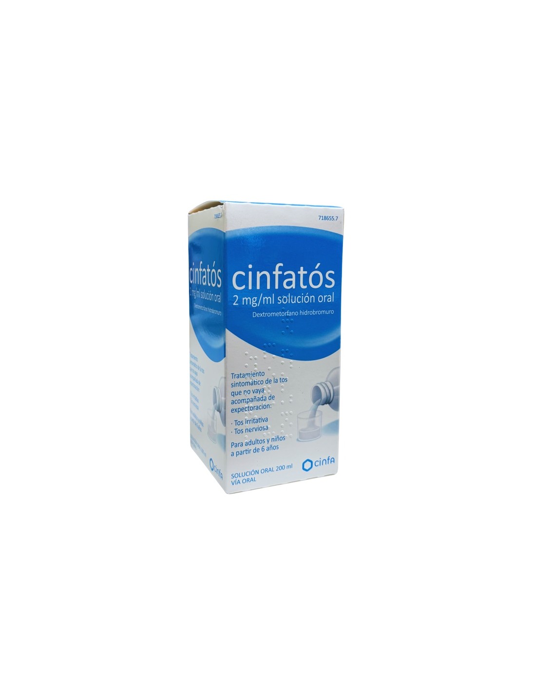 Cinfatos Solución oral 200 mL contiene dextrometorfano como principio activo. Es un antitusivo que inhibe el reflejo de la tos.