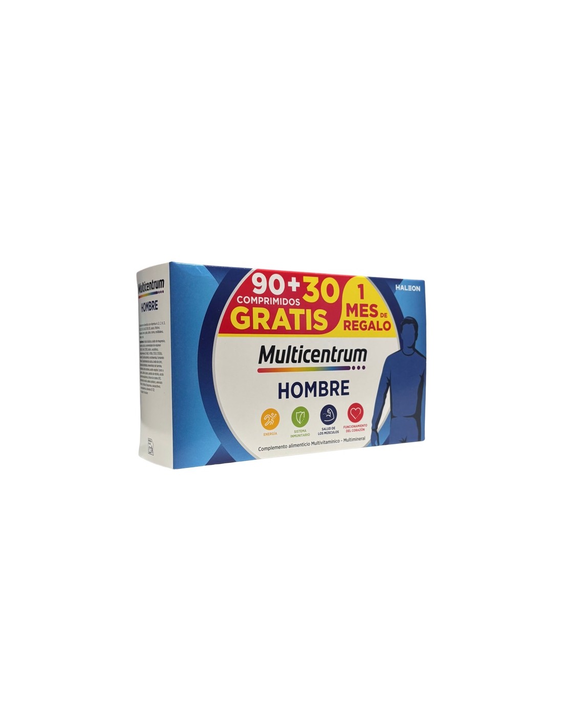 Multicentrum Hombre 90 + 30 comprimidos pack es un suplemento de vitaminas y minerales que mejora el equilibrio nutricional que el cuerpo necesita. Gracias a su combinación de vitaminas y minerales, ayuda a satisfacer todas las necesidades energéticas del organismo.