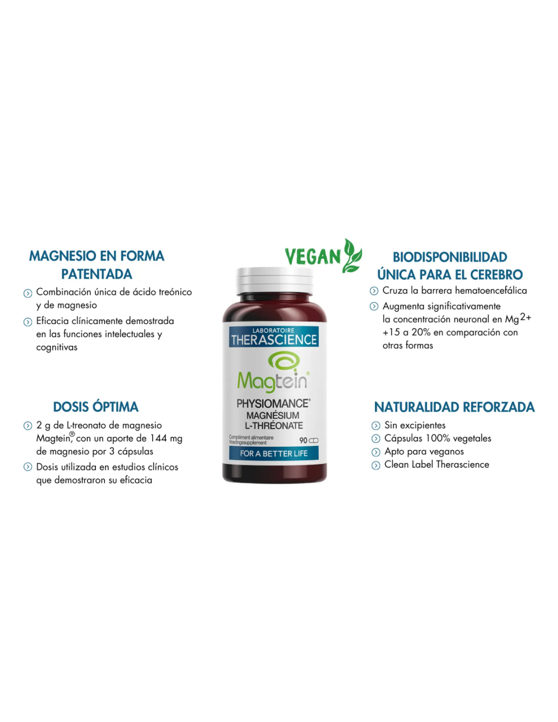 Posología basada en estudios clínicos: 2 g de Magnesio L-treonato Magtein® por 3 cápsulas.